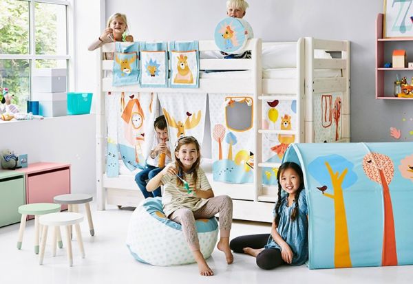 FLEXA/芙莱莎森林系列家纺产品蓝绿色调的色彩自带清凉属性。动物、尘土、水和植物等自然元素能吸引孩子们的注意力,鼓励他们在自然营造的环境中玩得开心,激发他们的想象力。设计师用柔和的色彩给孩子们一个轻松惬意的居家环境。能与之搭配的床品、壁纸和窗帘都拥有统一的色彩和图案,让儿童房主题更鲜明。