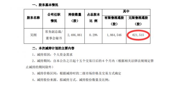 根据相关拟减持公告显示,吴刚持有公司248.6万股公司股票,其中有限售为186.45万股,无限售为62.15万股。而此次吴刚要减持的数量为手中的所有无限售流通股。华帝股份称,减持原因为个人资金需求。