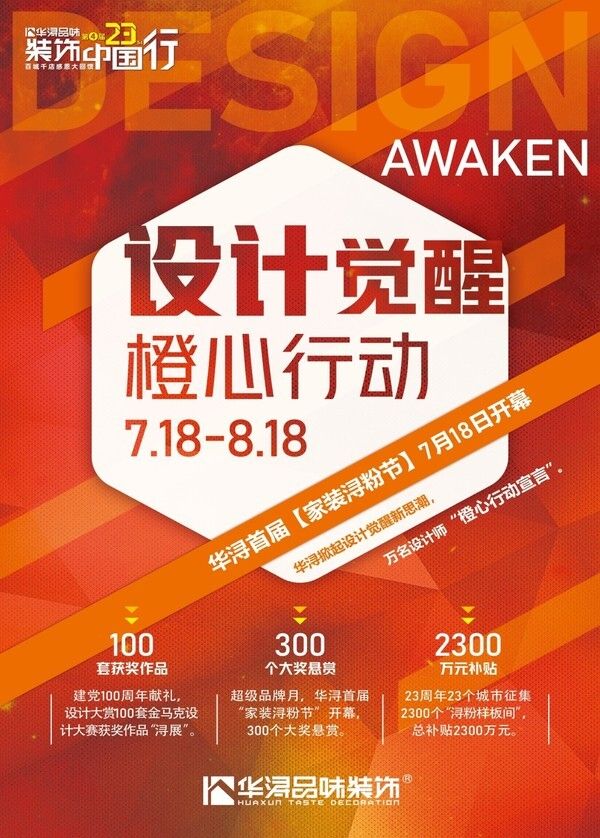 华浔品味装饰专注装修设计23年,在设计上秉承“关怀为本 设计有爱”的核心理念,坚持原创设计,拒绝千篇一律,专注满足客户高品味的个性化装修需求,为客户创造美好生活居住空间。7月18日—8月18日,以“设计觉醒 橙心行动”为主题的大联动活动在华浔品味装饰集团4个大区23个城市盛大开幕!