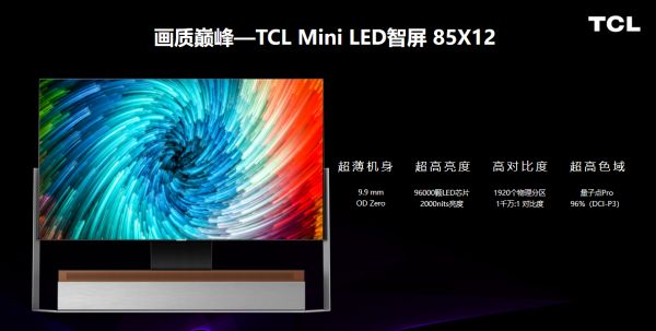 据了解,在配置上,TCL X12 8K Mini LED星曜智屏配备了9.6 万个LED芯片+1920个物理分区设计,能够使得智屏轻松拥有高达 2000nits的惊人亮度和10000000:1 高对比度。同时,TCL X12 8K Mini LED星曜智屏还搭载量子点Pro显示技术,可以10.7亿级别的色彩显示能力,157%(BT.709)的色域覆盖率,以及58.3%的色纯度,画面色彩更加纯净自然。TCL的这款8K mini LED显示屏拥有更大的屏幕、8K的显示分辨率、更薄的厚度以及更好的画面,全方位的展示了什么叫做无短板。