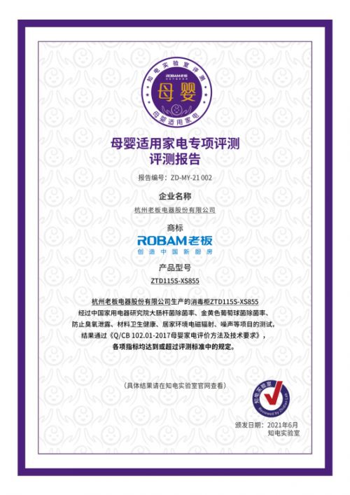 作为中国家用电器研究院创建的国内权威消费者评测机构,知电实验室在推动母婴家电性能提升的道路上精挑细选、严苛把关,并为达到母婴适用家电评价标准的品牌和产品颁发证书和标识授权。不仅让用户买得放心,更是每一个母婴家电科技好产品的身份证明。据了解,首批获得认证的母婴家电产品老板超级消毒柜2.0 XS855表现优异,在大肠杆菌、金黄色葡萄球菌的除菌率测试中,均达到或超过了评测标准中的规定。此外,它还独创了母婴消毒模式,消毒全程不使用臭氧,完全规避了臭氧泄露风险。