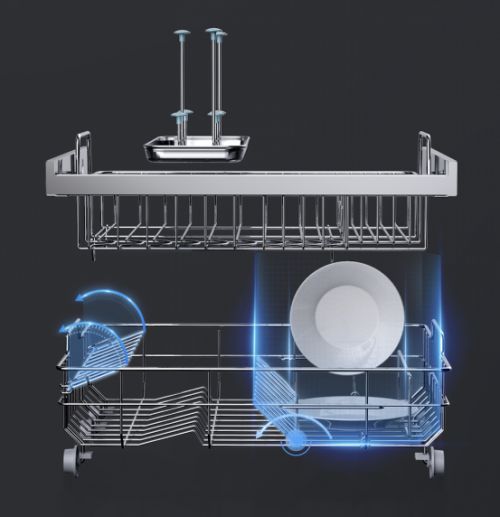 老板超级消毒柜2.0 XS855有115L超大容量,大到鱼盘、汤碗、10英寸的果盘砧板,小到汤勺、筷子、叉子和日常用到的盘子、碗,它都能装下。除此之外它还提供了双层百变碗架,实现不同角度灵活调节。