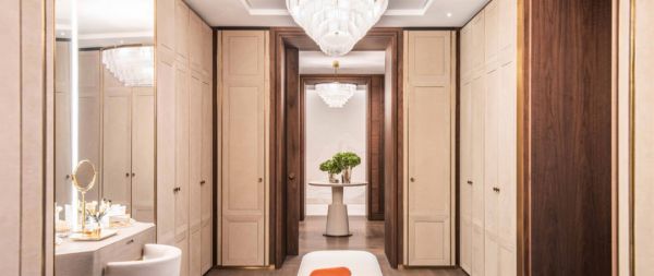 衣柜设计风格遵循了整体建筑的历史风貌,将暖色搭配延伸至衣帽间。值得一提的是,衣帽间柜子的长宽高尺寸是设计师精心打造的,拥有完美比例。