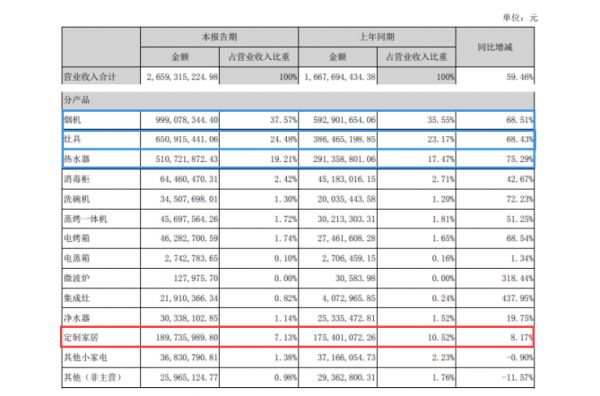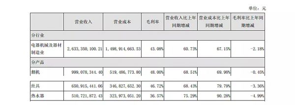 根据年中报告显示,华帝股份电器机械及器材制造业的营业收入为26.33亿元,同比增加60.73%。细分来看,烟机仍是营收重头,其营业收入为9.99亿元,同比增加68.51%,灶具的营业收入为6.51亿元,同比增加68.43%,热水器的营业收入为5.11亿元,同比增加75.29%。