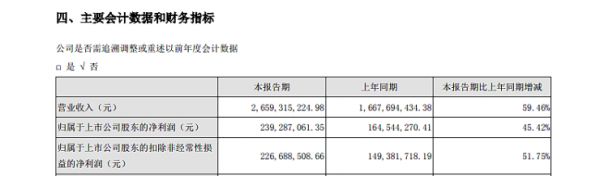根据半年报显示,华帝股份营业收入为26.59亿元,同比增长59.46%;归属于上市公司股东的净利润2.39亿元,同比增长45.42%,净利增长近五成。