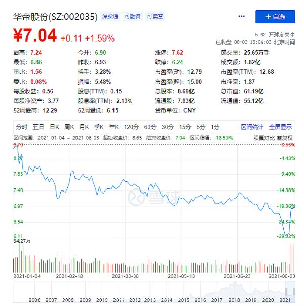毛利率接连下降、营收增速放缓,这一系列的动荡也让华帝股份的股价“起伏不定”,2021年1月4日开盘价为8.65元,截至8月3日15:04,收盘价为7.04元,跌18.59%。