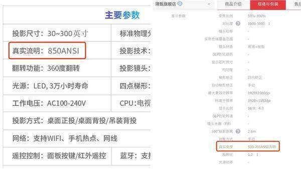 为什么小编对于璟甄M6的亮度有多种写法呢?小编为大家解释一下,在商品的介绍图中是850ANSI(仔细看图你就会发现这个数值的字体与其他不同,有更改的痕迹);在详细的规格表中,所标注的是500-700ANSI,这个亮度是小于当贝D1实际750ANSI的亮度。