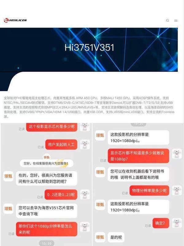 小编对于璟甄M6的实际分辨率也存疑,按照投影仪的价位来说,近千元投影仪是很难有真1080P高画质的出现。小编抱着疑惑去问了客服,没想到客服的回答也让小编有点失望,没想到客服的专业知识如此欠缺,连显示芯片与处理器的概念都混淆了。通过客服的回答,小编也去寻找了对应的海思芯片的参数,其中也没有寻找到关于分辨率的解释。当贝D1采用的是0.3’’DMD的显示芯片,其标准分辨率为720P,兼容分辨率为1080P。