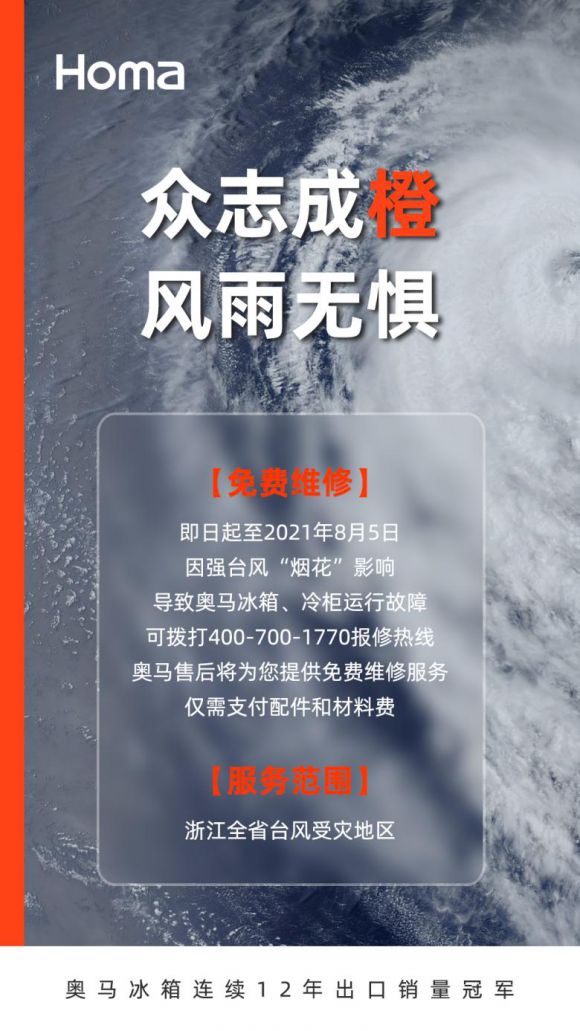 奥马冰箱不仅为河南受灾人民提供帮助服务,也为遭受台风“烟花”袭击的浙江伸出了援助之手。7月26日,台风“烟花”登录浙江,奥马冰箱立即采取了与对河南受灾人民一样的措施,为浙江人民提供免费上门检查冰箱服务。