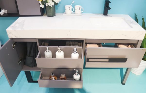 独特分层的抽屉,一半内里可以放置洗脸巾、吹风机、浴帽等物件,一半镂空的置物格,可以摆放常用的化妆品或沐浴露、洗发露等,这样不占用外部空间,存取也方便。所有的瓶瓶罐罐和毛巾、备用物品都能告别杂乱拥挤,轻松维持浴室空间的美观整洁。