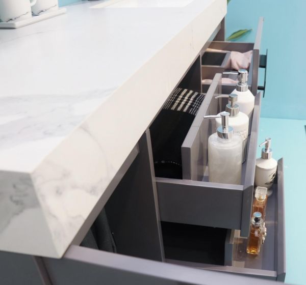 台下柜是该浴室柜的一大亮点,独树一帜的分层、半镂空式大容量抽屉设计,不仅在外观上极具现代设计美学风格,在收纳功能上也有着硬实力。