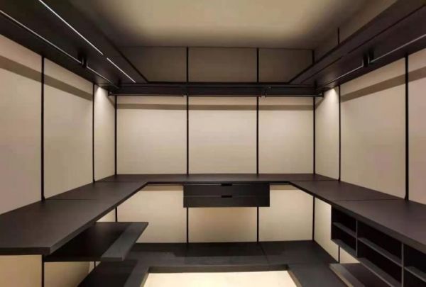 主卧套房没有做大的更改,因为夫妻俩对储物要求很高,两口子配有独立的衣帽间设计,大面积落地玻璃将窗外景色引入室内,为了增加功能场景、也为了避免空间压抑,设计师隐形门和护墙设计,整个空间简洁时尚,没有多余的线条。