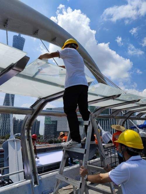 海心桥的光伏玻璃和人行走道上方夹层玻璃施工现场
