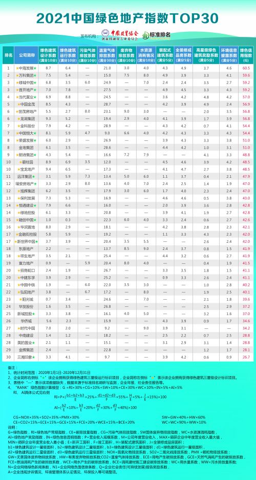 标准排名在过去6年开展绿色地产评价工作的基础上,根据房企百强的绿色建筑、装配式建筑和全装修成品房新开工和竣工绿色发展数据、包括直接碳排放和消耗建材、施工建设、用水耗能等间接排放在内的温室气体排放、污染气体排放、固体废弃物排放、水资源消耗和环境信息披露等六大方面、10个细分指标系数、200多个原始数据,研究制定了更加科学合理的“RANK”绿色地产指数评价模型,并经过详细测算得出2021中国绿色地产指数TOP30,为企业、金融机构和监管部门开展绿色金融工作提供参考和借鉴。
