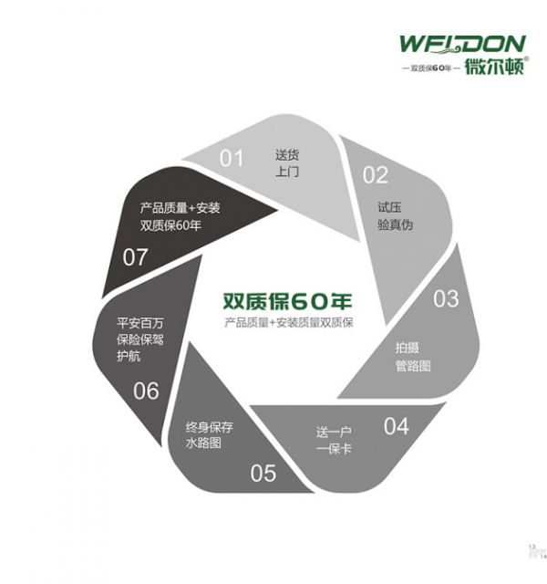 微尔顿管道14年来在家装服务各个环节中始终贯彻绿色、环保、健康、安全、可持续发展的理念,一直坚守客户满意的核心价值观,为广大客户提供高品质的一体化家装服务。微尔顿所有产品原料均来自世界顶级的Borealis北欧化工原料,只选用高品质环保铜,采用全流程质量管理体系,所有产品都严格执行原料检、在线检、成品检、入库检、出厂检五重检测,还有微尔顿独创的PPR净水管道技术,彻底解决安全用水问题,确保每一滴水都安全健康。