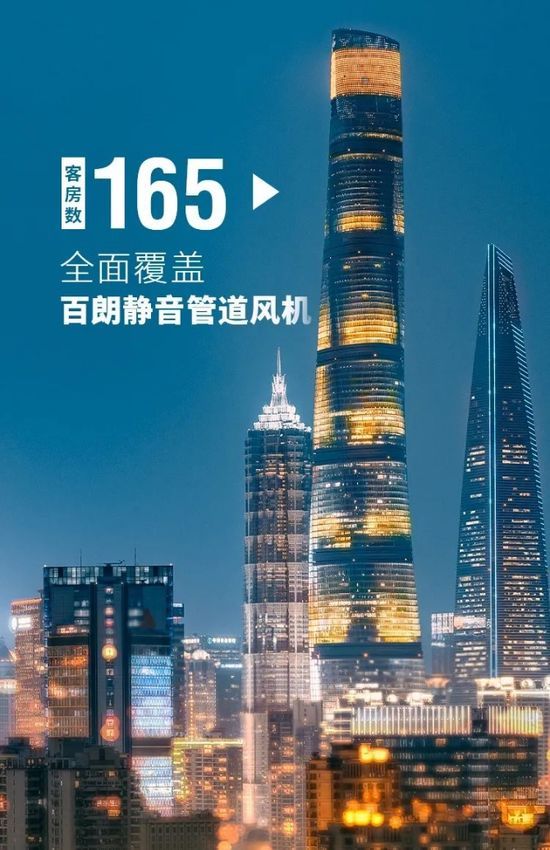 上海中心J 酒店位处上海陆家嘴金融核心区,高踞上海中心大厦之巅。坐落于上海中心大厦84至105层以及120层,共有165间豪华客房和套房,客房面积从62平方米至380平方米不等,是上海最高最大的客房之一。酒店设计融合了上海摩登文化和中国传统优雅,寓意是在喧嚣城市中开辟了一片世外桃源。其165间客房全面覆盖百朗静音管道风机,为其营造了舒适、安静、清新的室内环境。