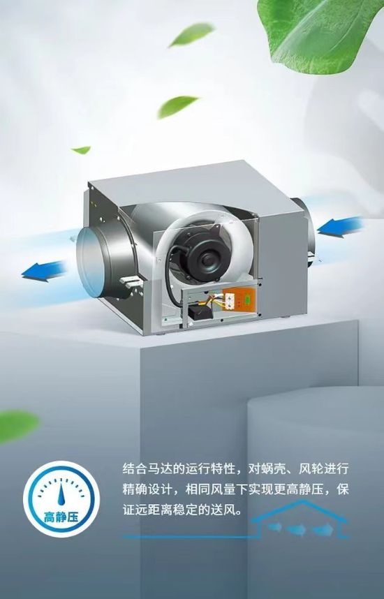 百朗静音管道风机结合马达的运行特性,对蜗壳、风轮进行精确设计,送风模式中相同风量下实现更高静压,克服管道阻力可以实现的最大送风距离,保证远距离稳定送风。