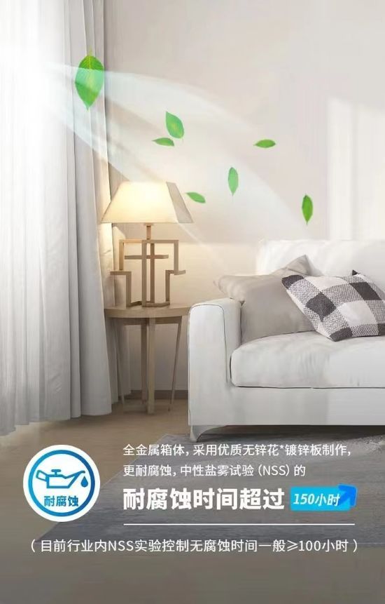 百朗静音管道风机为全金属箱体,采用优质无锌花镀锌板制作,相较有锌花材质,更能适应高耐腐蚀要求的场合。中性盐雾试验(NSS)的耐腐蚀时间超过150小时。长时间经受腐蚀考验,给你更久的新风体验。