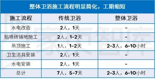 当前整体卫浴施工最快仅需2人4小时即可完成,而传统卫浴所需十余个工种,装修工期至少十六天,时间成本优势明显。