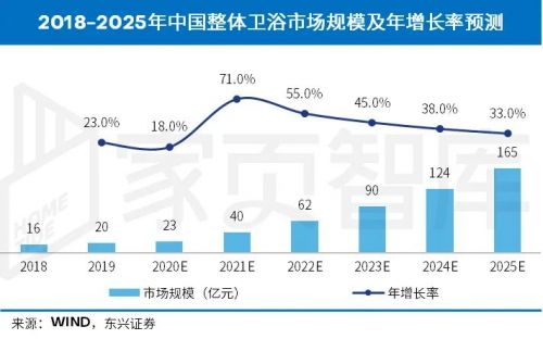 考虑到装配式建筑推广和整体卫浴渗透率的提升,预计2018-2025年整体卫浴主要应用市场(酒店/公寓/住宅)规模将从16亿元扩张至165亿元,复合年增速达到39.6%。
