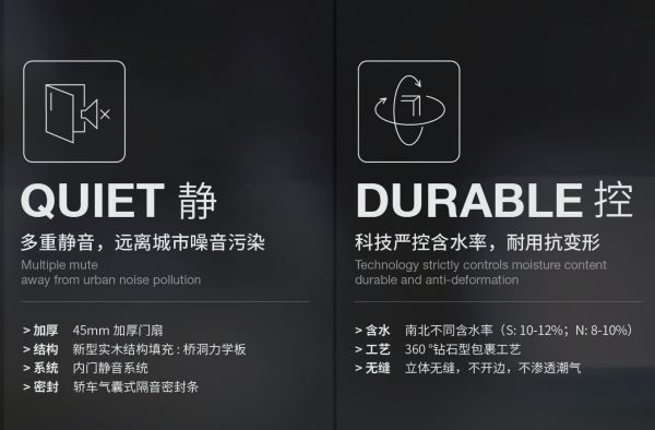 新型实木结构,100%填充,门芯与面板结合更加稳定,不会存在传统木门结构中的波纹与空鼓,其稳定性约为原木结构的3到4倍,表面抗冲击力、上下拉伸力均强于普通木质结构。多孔多腔体隔音结构可以破坏声音传播结构及路径,4公分厚度隔音效果可以达到无音状态,还有德国轿车级别气囊式隔音皮条、静音锁具等等,多重静音设计阻隔城市的喧嚣,让主人远离噪声污染,静享人生欢愉。