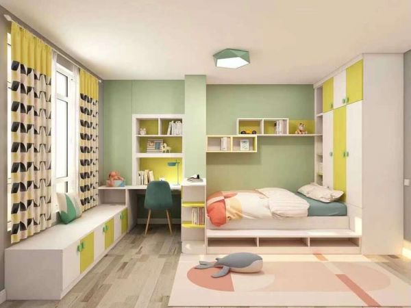 孩子的身体还处于发育阶段,对有害物质的抵抗能力较弱,所以儿童房装修对环保性的要求极高。因此不论是墙面使用的涂料、地板还是家具都要选择绿色环保且符合国家标准的。墙面适宜使用水溶性、环保型、耐擦洗的内墙涂料,很多品牌漆都有专用的儿童漆可供选择。如果要做定制家具,也要好好选好板材,最好选择无醛添加的板材,比如全友的绿色生态板,不仅无甲醛还使用了抗菌工艺,能更好地呵护孩子成长。