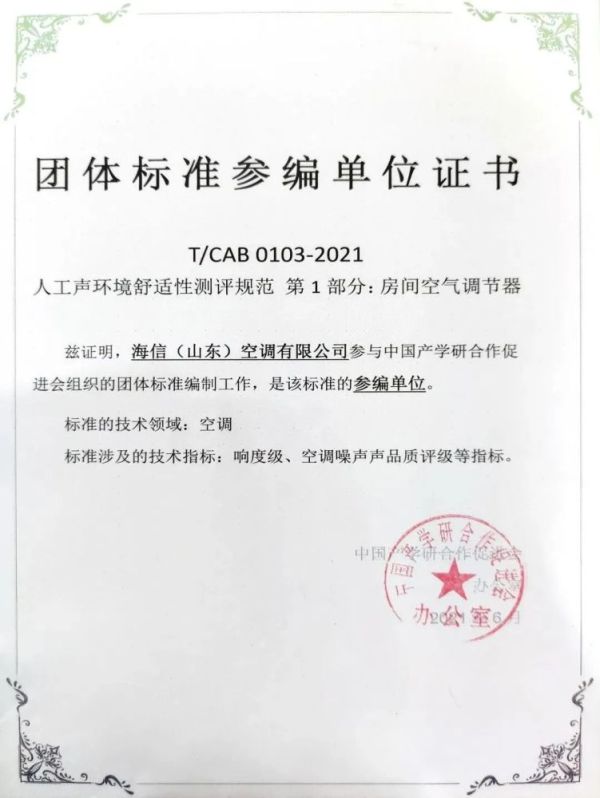 海信空调参与制定团标《人工声环境舒适性测评规范 第1部分:房间空气调节器》行业首个声品质团体标准规定的内容,已于6月11日已发布实施。