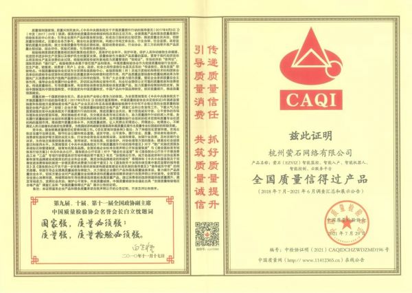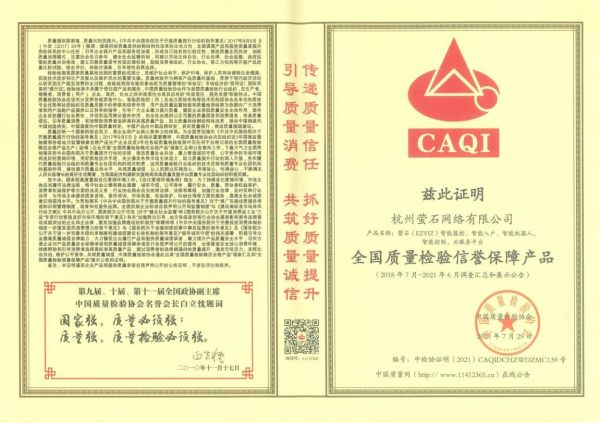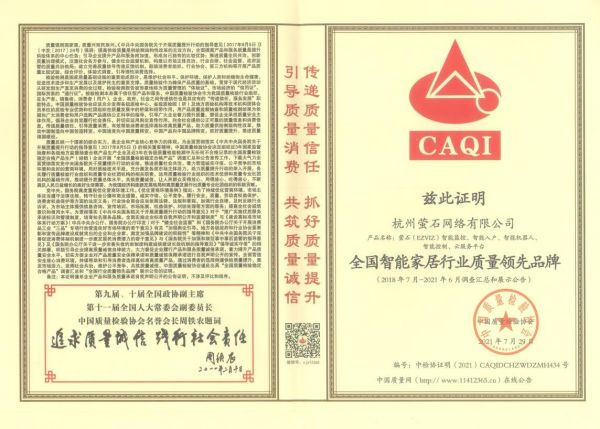 萤石此次获得”全国质量检验信誉保障产品”、”全国智能家居行业质量领先品牌”、”全国质量信得过产品”奖项,是中国质量检验协会对企业产品质量的肯定,也为消费者提供了一张放心消费的“通行证”,萤石对产品品质提升的追求将一直延续下去。