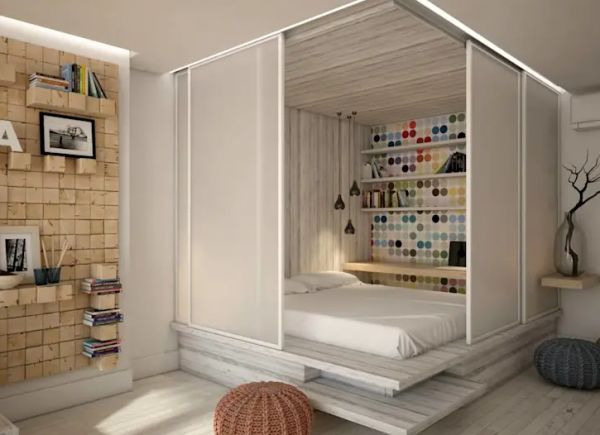 房子没有卧室间隔?不要紧,像悠美居设计师一样用拉门分划出睡床空间就好了!以木制平台把床升高,用磨砂拉门来打造独立的私人卧室,尽用空间之余也确保了隐私。