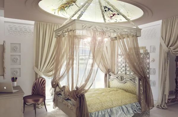 大家好像回到中世纪时期的皇后房间里吧?悬空的床铺四周围上了半透明的床帘,床头板和床尾板上的雕刻跟卧室的墙上的雕饰互相呼应,配搭荷叶边的床垫,共同打造出极致奢侈的气派卧室。