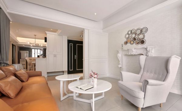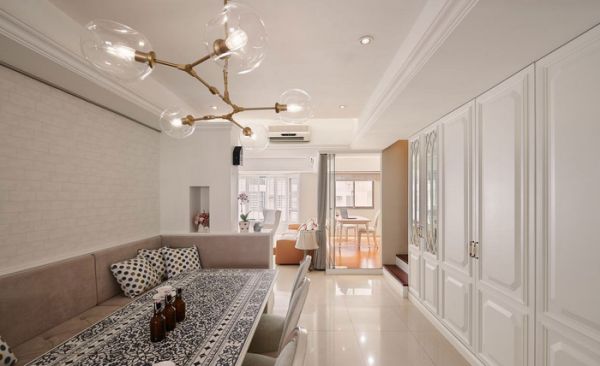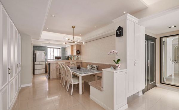 顾及屋主大量的收纳机能,因此将柜体集中处理,像是一进门的玄关柜,以及转进走廊的餐椅背柜、餐厅收纳柜等等,并统一以白色线板门片处理,将乡村风格完全展现。尤其是餐厅廊道的整面柜体,不但是收纳柜,还将进出卫浴的门片隐藏其中,而转角的玻璃橱柜,展示屋主收藏,圆弧线条设计柔和空间感。