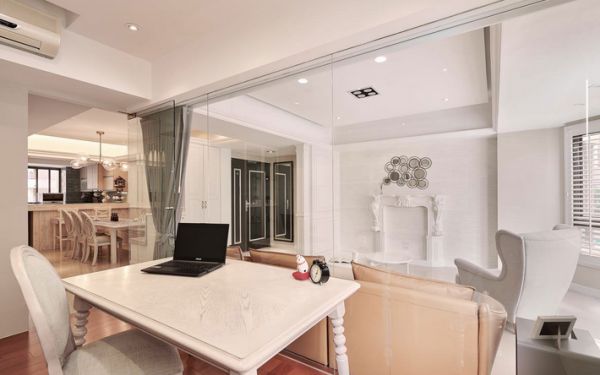 由于夫妻两人在家里,必须时时刻刻照料及关注孩子的一举一动,因此连书房隔间都采玻璃设计,不但让采光及视觉能延伸,也可以观察孩子在公共空间里的活动。架高木地板以界定彼此空间,且必要时,可以用窗帘来区隔成独立房间。而书房白色悬吊书柜,成为沙发背墙的焦点。