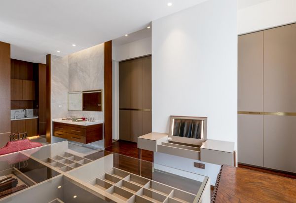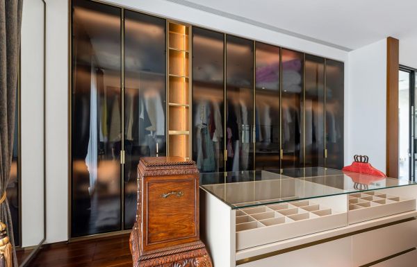 以衣帽间为例,本案中设计师从使用者日常所需的功能出发,塑造自然舒适、乐享人生的私属空间。推开一扇门,细数衣柜架上的收藏,将心情藏于此,然后悠然释放,在明媚而柔和的灯光下,欣赏衣物派对的琳琅满目,人生成就感、生活的品位感,在此绽放。天工之作通过这样的衣帽间设计,想要传达的大概就是——成功的人生,未必都很宏大,有时可以浓缩到一个称心美丽的衣帽间,一段在卧室一角盛开的甜蜜时光。