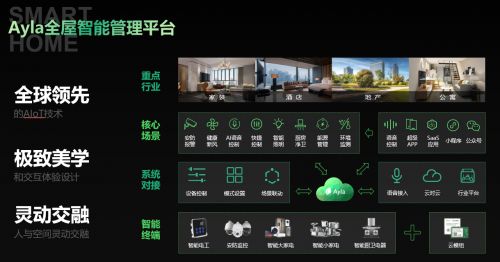 “Ayla艾拉物联第四代主动式全屋智能解决方案,已经可以实现根据用户所在的场景数据和环境数据,进行云端AI运算,自判断、自主处理,自主调节全屋空气、温度等,通过云端记录用户喜好及行为,为用户推送无感的、自适应式的主动式服务,从根本上摆脱产品同质化、伪智能的弊端,助力地产、酒店、家装进行一站式的智能化改造升级,为用户打造打造有温度、主动式、无感式的智能家居生活服务。”