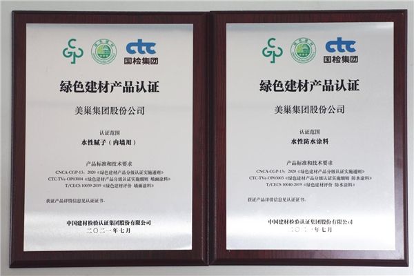 据了解,本次获批机构认证类别及领域包括围护结构及混凝土类,门窗幕墙及装饰装修类,防水密封及建筑涂料类等。美巢集团“水性腻子(内墙用)”、“水性防水涂料”产品获得“绿色建材产品认证”证书,均为国检集团颁发的行业相关领域首批证书。