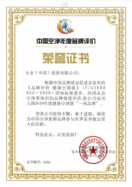 此次品牌评价活动中,大金空调凭借着近百年来在专利研发投入、技术体系打造、产品质量标准、社会责任响应等方面的优异成绩,成功入围2020年度健康空调器“一线品牌”。