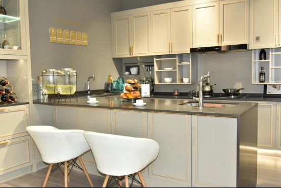 为了满足小户型空间利用最大化的需求,还可以将岛台一测延伸设计成吧台,形成一个整体,可隔断厨房与其他空间。吧台可化作餐桌或休闲区,可在此享受早餐,下午茶,约三五好友品酒、喝咖啡、聊天,为生活注入一丝惬意与闲适。岛台下面还可以通过嵌入拉篮、米箱、分类垃圾桶达到分类储物,让物品摆放更有序、整齐。