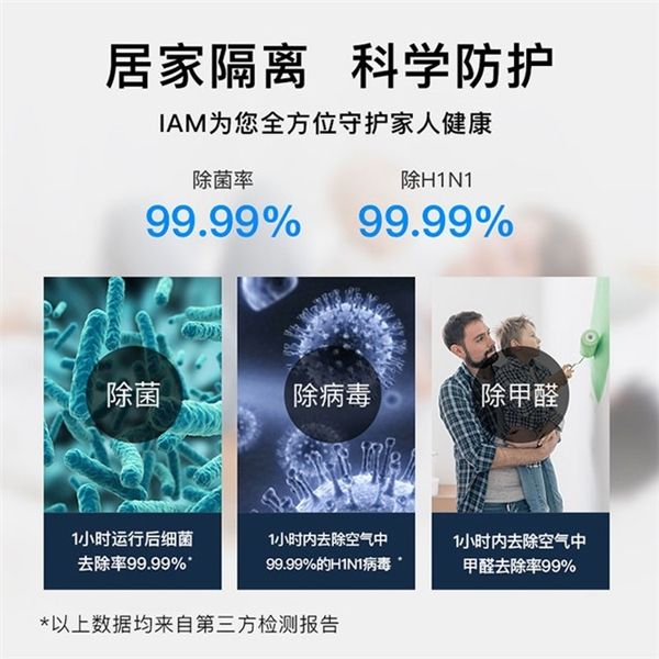 值得一提的是,IAM旗下部分空气净化器还采用了紫外线UV杀菌技术,能够有效检测和减少细菌与病毒,过敏原等,且除菌率、过滤H1N1流感病毒最高达99.99%,对白色葡萄球菌等常见致病菌毒的抑制率也达到了99%以上,在杀菌的同时可释放千万级负离子,主动寻找空气污染并击沉,从而帮助居家、办公等室内场所能更有效地避免病毒的侵扰。