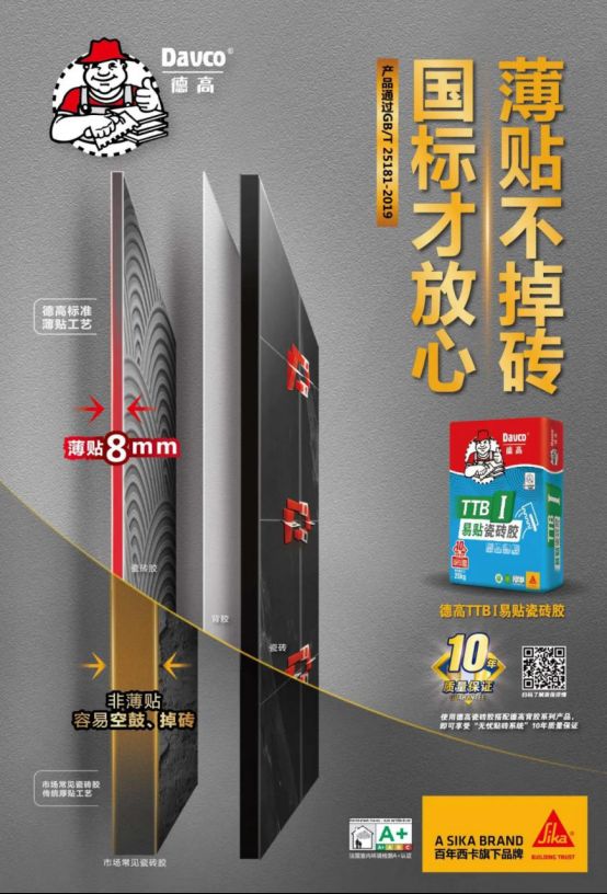 使用瓷砖胶薄贴工艺,不仅能省空间,而且瓷砖胶用量仅为传统砂浆的½或⅓,用料更少,不仅粘结效果非常出色,还能减少水泥、砂石的用量,大幅降低碳排放。所以说,用瓷砖胶薄贴工艺贴砖,牢靠又环保!