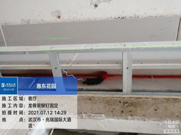 在吊顶施工中,吊顶拐角处居然装饰并不使用常见的两块板的拼接工艺,而是全部采用L形石膏板进行施工,最大程度的防止开裂问题。在龙骨与龙骨之间,居然装饰全部使用双铆钉进行固定,更好的保持了龙骨之间的水平距离,增加龙骨的安全性,而在边龙骨处,也全部使用膨胀螺丝进行固定,使吊顶更加稳固。