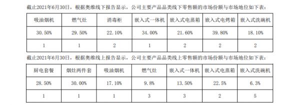 根据奥维云网数据,截至今年6月末,老板电器的主要产品中,吸油烟机、燃气灶、嵌入式一体机的线下零售额的市场份额均排名第一。线上零售额方面,老板电器的厨电套餐、烟灶两件套、吸油烟机市场份额排名均为第一。