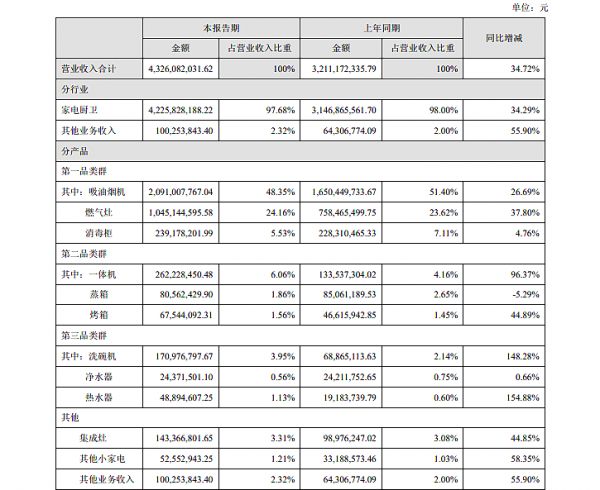 根据老板电器半年度报告显示,今年上半年,老板电器实现营业收入43.26亿元,同比增长34.72%;归属于上市公司股东的净利润为7.90亿元,同比增长29.08%。这是自2018年以来,老板电器业绩增速重回两位数增长。