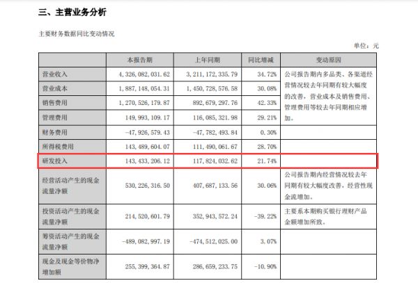 2021年,老板电器加大了技术板块的研发投入力度。根据半年度报告显示,2021上半年老板电器的研发投入1.43亿元,相较于去年的1.18亿元,同比增长21.74%。