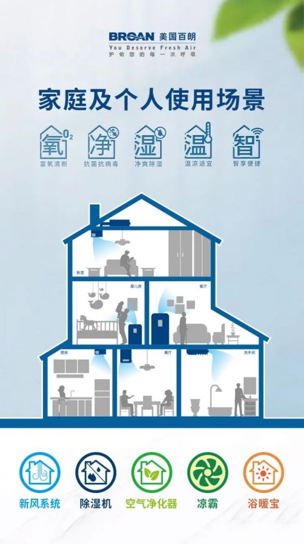 近来,变异新冠病毒 Delta引发的疫情备受关注,Delta病毒通过呼吸(飞沫、气溶胶、空气内高浓度的悬浮病毒等)传播,即使Delta传染性很强,NPI(非药物干预措施)对 Delta 仍然起效 。其中,除了个人的勤洗手、戴口罩、保持社交距离外,室内通风换气也十分重要。百朗新风(BROAN)系统可全面覆盖室内空间,有效抵御PM 2.5、细菌、病毒等污染物,保持室内空气洁净,保护呼吸健康。无论是家庭中的孩子、老人,还是商业场所中的工作族,都如同戴上隐形口罩,护佑您和家人的每一次健康呼吸。
