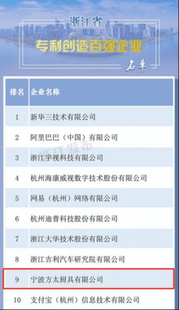 今年上半年,浙江省市场监管局(省知识产权局)发布“浙江省创造力百强企业榜单”,厨电企业方太力压一众科技公司,以599件发明专利拥有量,入选全省企业TOP10。
