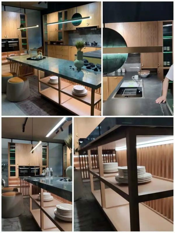 另外一套东方风格的产品,利用不锈钢木纹转印技术和原木及玻璃的结合,较好的融合了厨房产品与东方元素的现代表达方式,呈现出与市场表面化的中式风格的巨大差异化设计特点。
