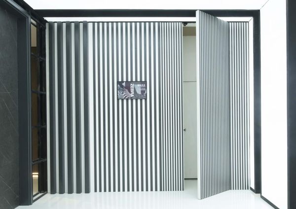 白色底板上,黑色格栅线条顺序排列,简单直白,由宽至窄,大面积铺陈演绎着条纹的经典魅力。门则隐于墙中,不打断线条的延伸舒展。极致的色彩对比配以律动的线条,在黑与白,宽与窄的戏剧性冲突中,玩味活力扑面而来。