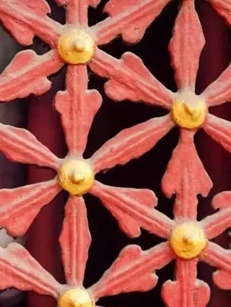 ▲菱花的中部,也就是木条交叉点上各有圆形的菱花帽钉。红色的木条,金色的帽钉,显得十分华贵。