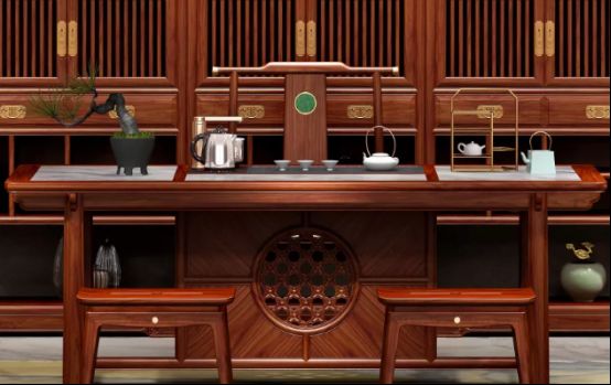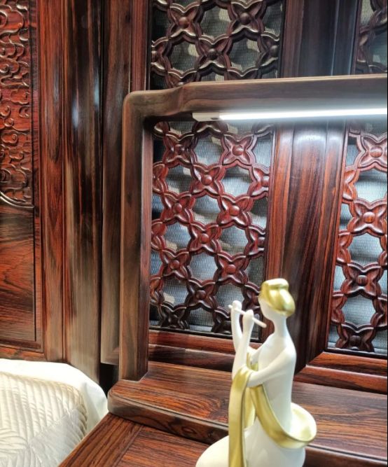 京熹国潮家居传承故宫美学,将故宫建筑门窗上常见的菱花纹,运用到红木家具上。并在原有基础上进行改良,使之在工艺和构图上越来越合理,视觉上越来越赏心悦目,锦上添花。