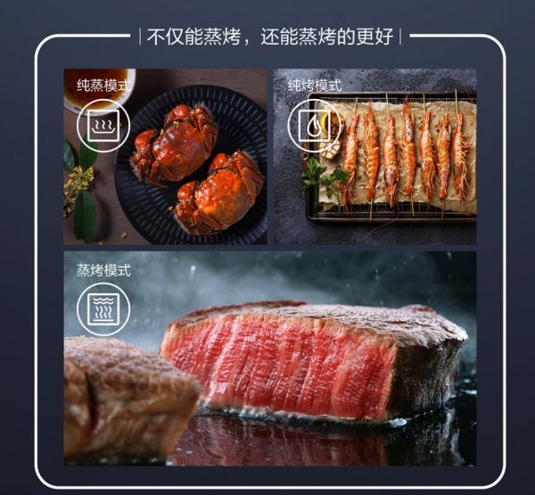 除烧烤外,樱花蒸烤一体机C5000还含有多种烹饪模式,可以轻松制作出色香味俱全的佳肴。想享用爽口雅致的清蒸美食,就使用蒸汽模式,精准稳定的蒸汽温度,让做鱼、蟹等海鲜变得更加容易。而蒸烤的组合模式适宜烤烤肉和烘焙,烹饪过程中释放细腻水汽,食物因此保留鲜美汁水和微量元素。